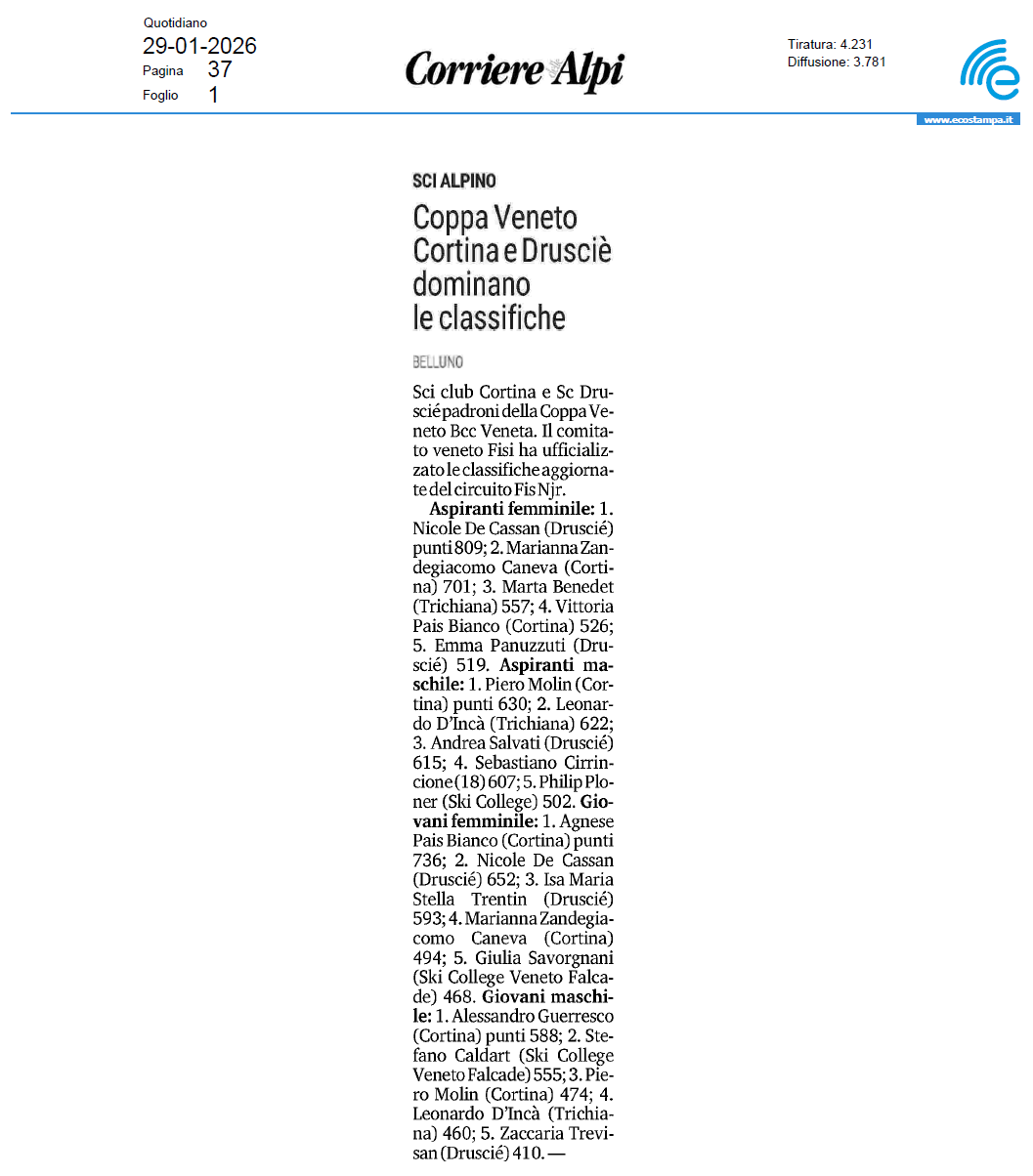 Coppa Veneto Cortina e Drusciè dominano le classifiche