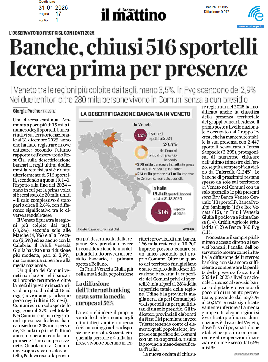 Banche, chiusi 516 sportelli_ICCREA prima per presenze